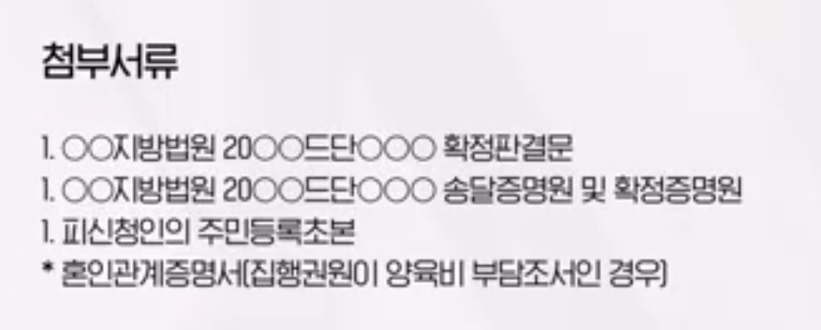 첨부서류는 집행권원과 집행권원의 송달증명원 및 확정 증명원, 그리고 피신청인의 주민등록 초본을 함께 제출하면 된다고 합니다. 집행권원이 양육비 부담조서인 경우에는 혼인관계 증명서도 함께 첨부해야 한다고 합니다.