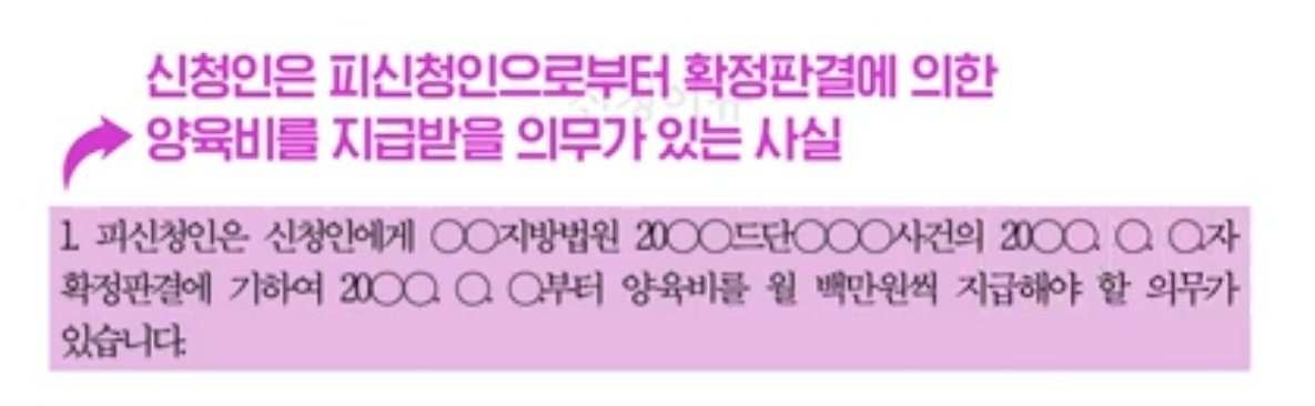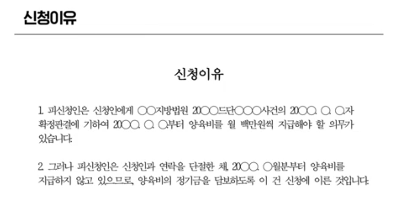 신청이유는 신청인에게 어떠한 진행권원을 통해 양육비 채권이 발생하였으나 피신청인으로부터 양육비를 지급받지 못한 사실을 기재하면 된다고 합니다. 집행권원은 확정된 판결문이나 결정문, 심판문, 조정조서와 같이 집행력이 있는 문서를 말한다고 합니다. 이혼소송의 판결이 확정되어 신청인에게 양육비 채권이 발생한 경우로 이혼소송의 확정 판결문이 집행권이 된다고 합니다.