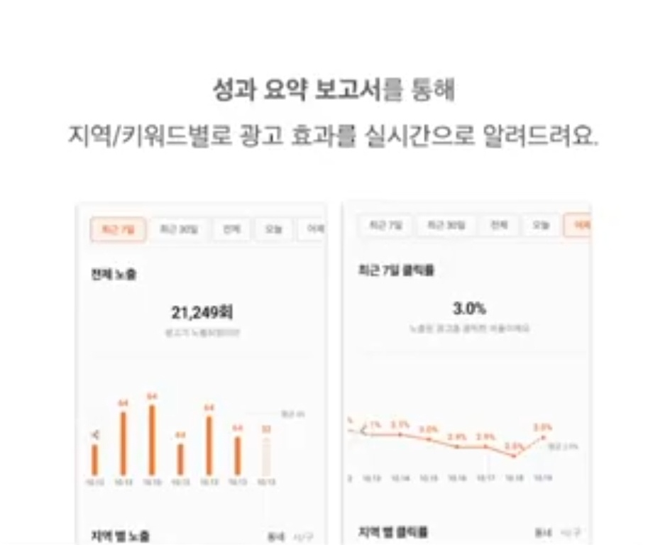 간편모드로 광고를 만드는 방법은 광고 노출 위치를 고르고 광고할 소재를 고르고 지역과 예산을 설정하기만 하면 광고가 바로 설정이 된다고 합니다. 추천 예산을 보여주므로 어렵게 느껴질 수 있는 예산 설정을 할 수 있도록 도와준다고 합니다. 광고할 지역과 기간을 설정하고 나면 ‘대략 이정도 금액으로 광고하세요.’라고 추천예산 금액이 나온다고 합니다. 그 예산을 보고 광고를 얼마를 사용할지 정하면 된다고 합니다. 성과 요약 보고서를 제공받을 수 있다고 합니다. 광고를 한 지역 혹은 검색광고 같은 경우 키워드별로 광고효과가 어떤 지역과 어떤 키워드에서 더 좋았는지를 볼 수 있다고 합니다. 클릭률이니 노출 정보도 볼 수 있다고 합니다. 이 성과 요약보고서를 통해 어느 지역에 광고를 더 해야 할지에 대한 정보를 얻을 수 있다고 합니다.