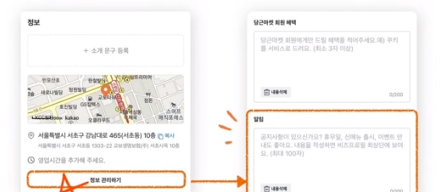 두 번째, 알림. 정보 관리하기에서 알림 메뉴를 작성하면 비즈프로필 최상단에 노출이 된다고 합니다. 단골 맺기를 유도하는 것도 좋고, 휴무 일자를 알려주는 것도 좋다고 합니다. 가게 이용하기 전에 미리 연락하고 와야 한다는 등 가게 방문하는 이웃들이 꼭 알아야 하는 사항을 적는 것도 좋다고 합니다.