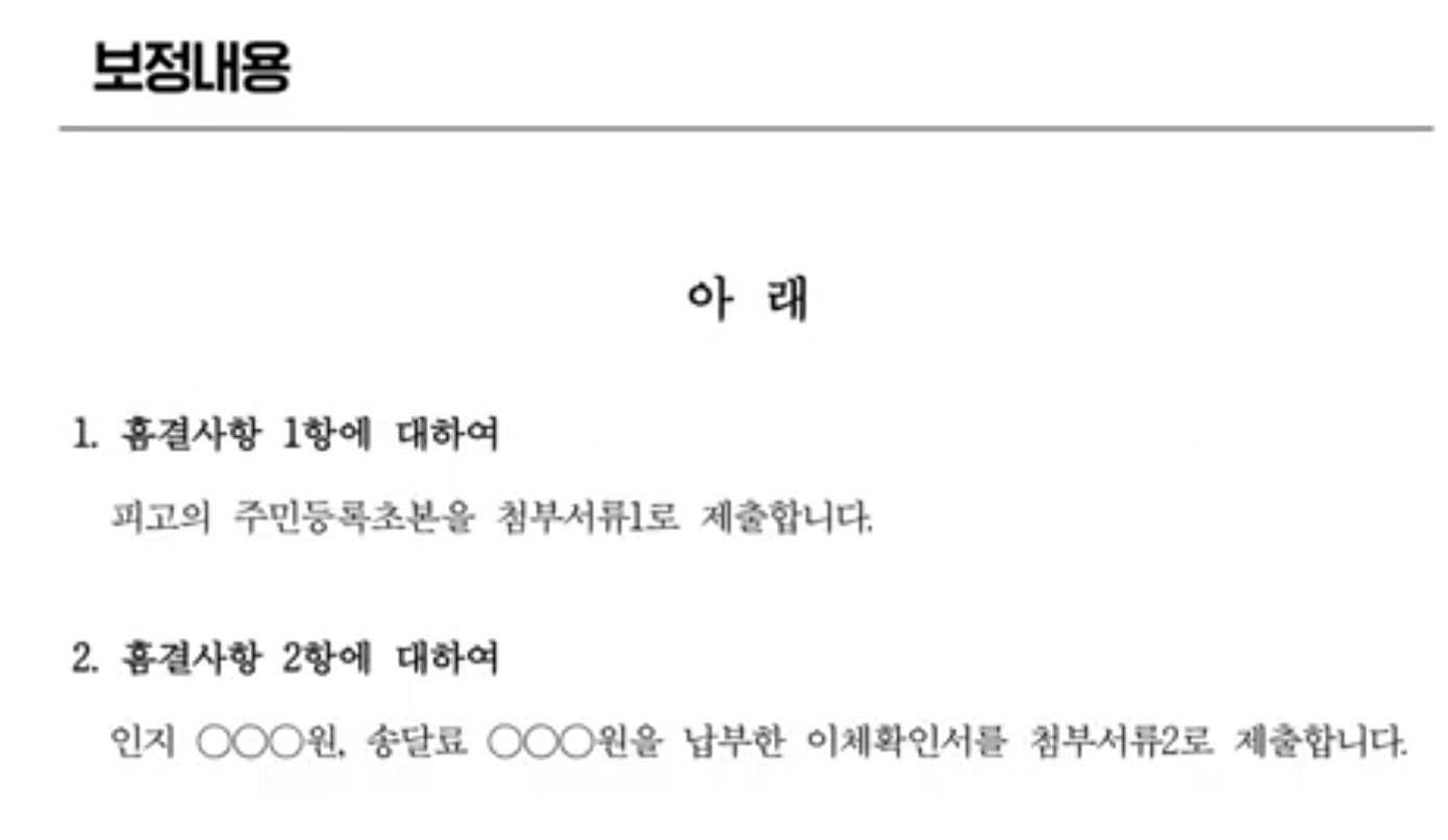 보정서에는 정해진 양식이 없고 보정명령에 따른 흠결사항을 보정하였다는 사실이 중요하다고 합니다. 흠결사항이 2개 이상일 경우에는 흠결사항 내용에 따라 항목을 나누어 기재해야 한다고 합니다. 주민등록초본을 제출하라는 흠결사항에 대해서는 피고의 주민등록 서류 일로 제출한다고 기재를 하고, 피고 주민등록초본을 함께 제출하면 된다고 합니다. 송달료를 납부하라는 흠결사항에 대해서는 인지송달료를 납부했다는 이체확인서를 첨부서류로 제출 한다고 기재하고 이체확인서 함께 제출하면 된다고 합니다.