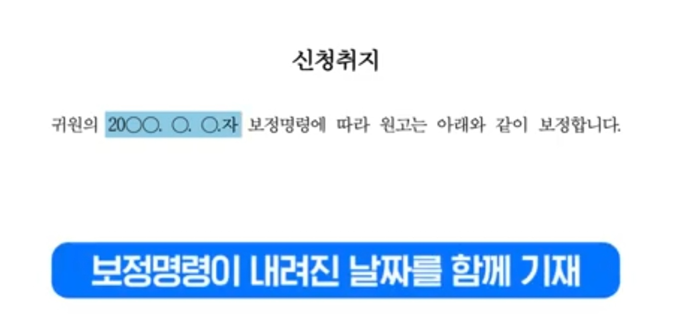 신청 취지는 귀원의 보정명령에 따라 원고는 아래와 같이 보정합니다 라고 기재한다고 합니다. 신청취지의 당사자의 명칭은 자신의 상황에 맞게 수정하고 보정명령이 내려진 날짜와 함께 기재하여 며칠자 보정 명령에 따른 보정서인지 특정해야 한다고 합니다.