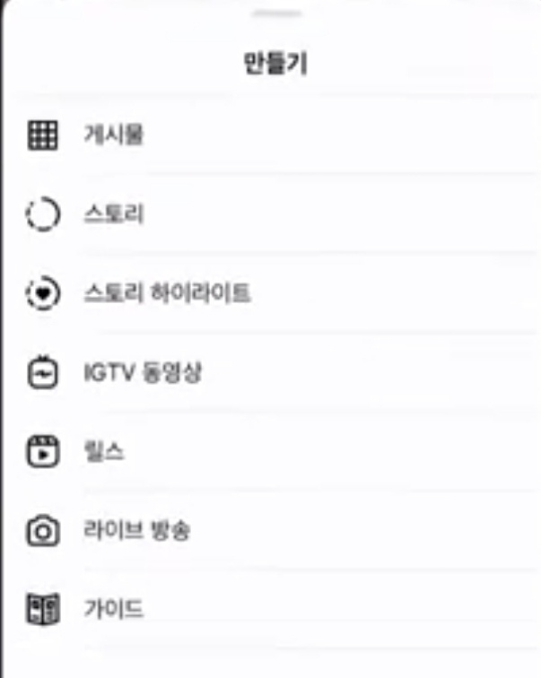 홈 상단에 + 버튼을 눌려서 아래쪽에 스토리를 누르거나, 하단 프로필에 가서 +버튼을 누르면 만들기로 해서 게시물, 스토리, 스토리 하이라이트, KGTV 동영상, 릴스, 라이브방송, 가이드와 같이 원하는 콘텐츠 종류를 볼 수 있다고 합니다.