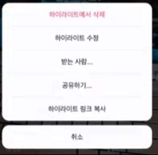하이라이트 수정 및 삭제를 원할 때에는 스토리 하이라이트를 열어서 아래쪽에 더보기를 누르면 하이라이트 삭제 및 수정이 가능하다고 합니다. 수정을 눌러서 커버의 내용을 변경 할 수도 있다고 합니다. 삭제 버튼을 누르면 하이라이트가 삭제가 된다고 합니다.